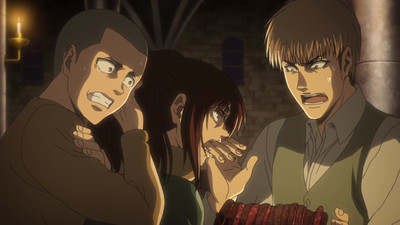 All of that foreshadowing is pushed aside for the most part, as the bulk of the episode actually takes place at the celebratory dinner that the scouts have all earned in preparation for the titular mission to ReTake wall Maria. This entire sequence is largely played for comedy – at the sight of fresh meat, Sasha literally goes insane with hunger enough to try and eat Jean's hand and has to be bound to a pole and gagged for the remainder of the night. Eren and Jean also get into a brawl over Jean's frustrations regarding Eren's tendency to suicidally charge into battle, with the main joke being that the rest of the crew has largely given up on trying to break up their brawling (except for Levi, naturally).